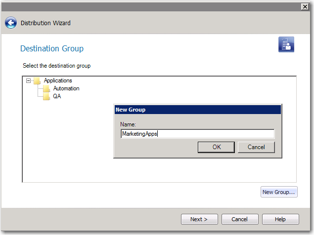 When publishing to ConfigMgr (Formerly called as System Center Configuration Manager), you can choose to create a new destination group directly from the Destination Group panel of the Distribution Wizard by clicking the New Group button and then entering a name for the new group in the New Group dialog box. AdminStudio will create that group on the specified ConfigMgr server, and publish the applications to that group.