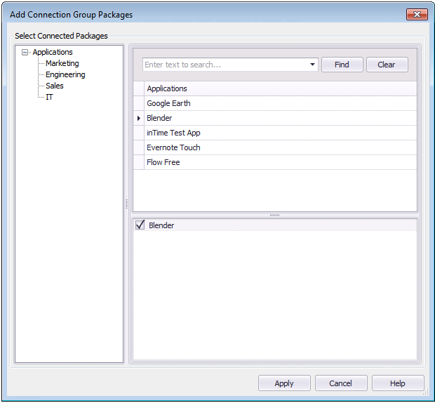 - Under Select Connected Packages , select the group in the tree that contains the App-V package that you want to add to the connection group. The packages in that group are listed under Applications .