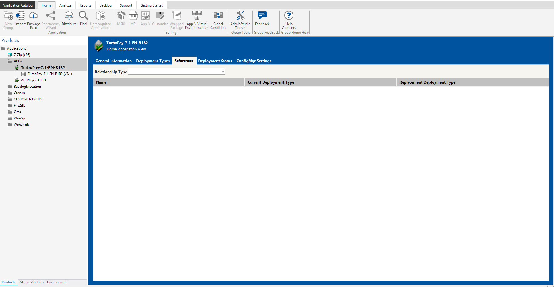 On the References tab of the Home Application View , you can view a list of packages that are dependent upon this application or that supersede this application. These dependencies are defined on the Dependencies and Supersedence subtabs of the Deployment Data of the Home Deployment Type View for a selected package. If another package has specified that it is dependent upon or supersedent to this package, that package will be listed here.