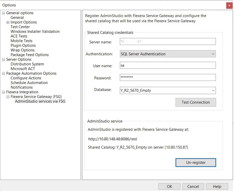 You identify the shared Application Catalog on the AdminStudio Services via FSG tab of the Application Manager Options dialog box: