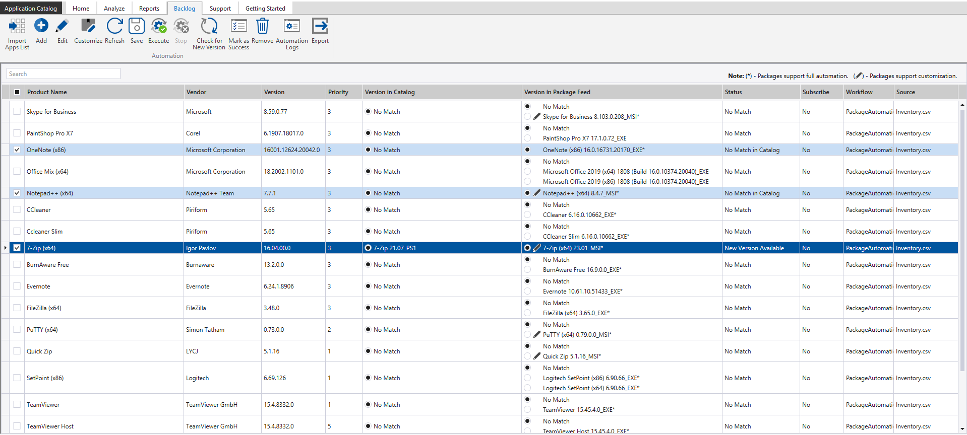 After the applications list is imported into the catalog, AdminStudio performs automatic matching of the applications in the list against packages in catalog and Package Feed Module.