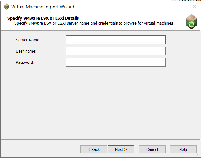 On the Select Virtual Machines from a VMware ESX or ESXi Server panel, you enter a server name and the login information to connect to a VMware ESX or ESXi Server.