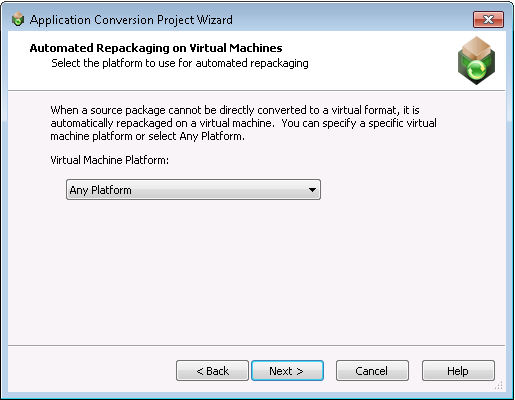 OS PlatformIf you select a specific operating system, the Automated Application Converter will use only those virtual machines that you have selected on the Machines tab that are of the selected operating system to perform automated repackaging. When you select a virtual machine to add to the Automated Application Converter, you need to manually identify the operating system platform either on the Select Virtual Machines panel or by clicking in the Platform field on the Machines tab and making a selection from the list.