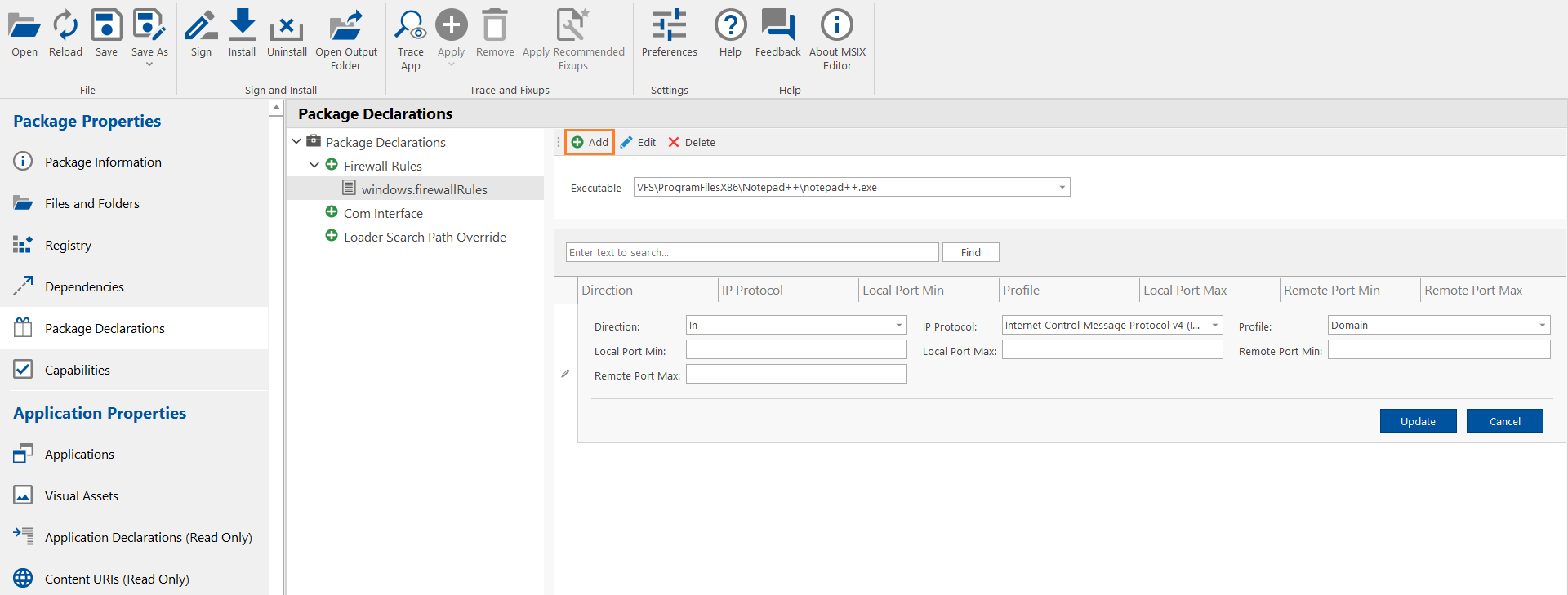 - In the Package Declarations pane, right-click on any declaration where you want to add properties, and then click on Add Rule as appropriate.